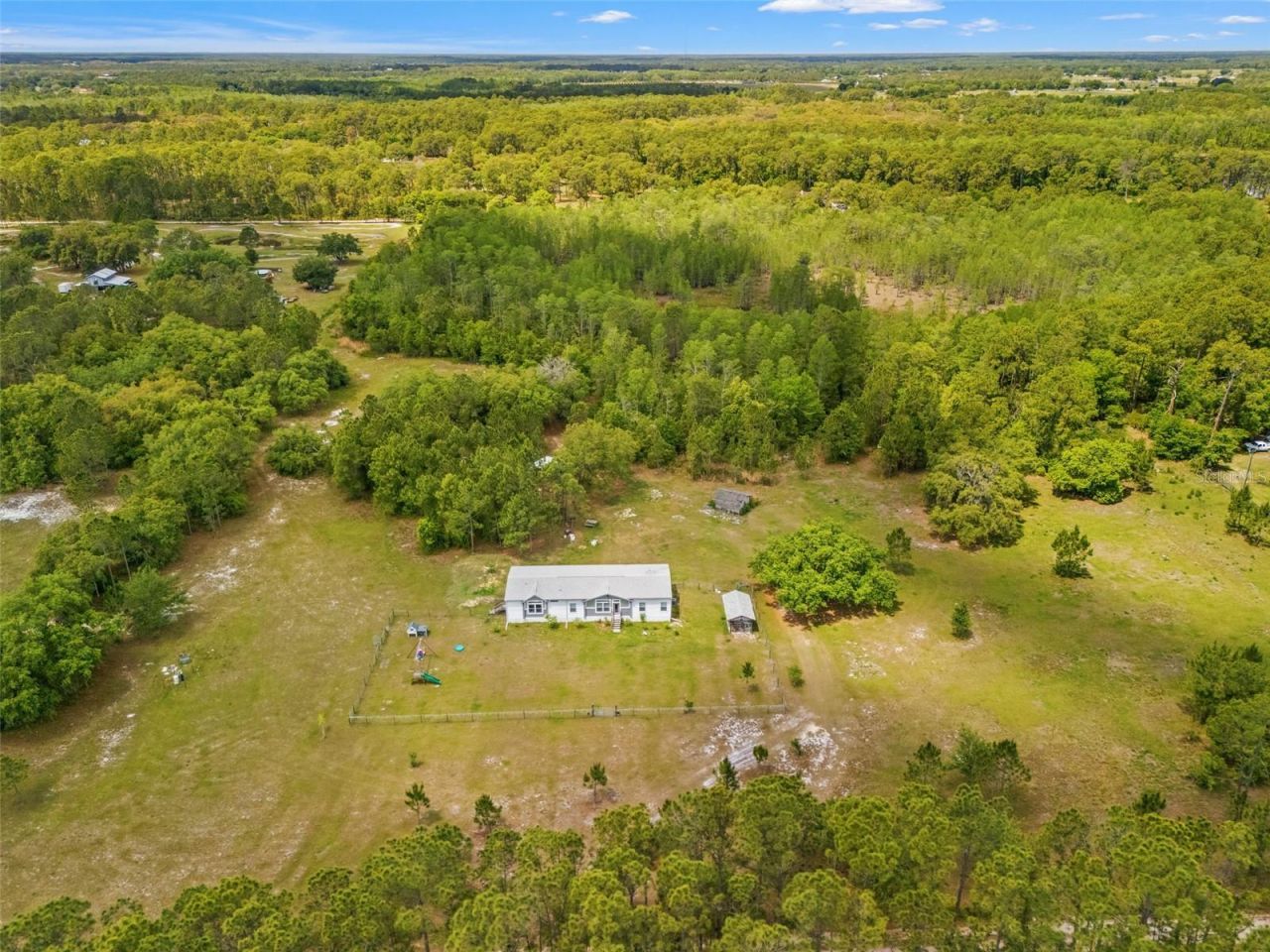 Escape to your own private 20-acre sanctuary in Groveland, where peace and modern comfort meet. This expansive property offers the ultimate Florida lifestyle, featuring a pond and sprawling, partially wooded acreage that provides a stunning backdrop for outdoor activities. The meticulously maintained residence spans over 2,200 square feet and welcomes you with a bright, open floor plan highlighted by high ceilings and stylish rustic accents.The heart of the home is a spacious living area featuring a beautiful wood-plank accent wall and an integrated electric fireplace, perfect for cozy evenings. Large windows throughout the home invite an abundance of natural light and offer serene views of the surrounding greenery. The gourmet-inspired kitchen and dining spaces flow seamlessly, anchored by a charming wooden beam and designer lighting.Retreat to the primary suite, a true oasis boasting a sophisticated board-and-batten feature wall and a spa-like ensuite bathroom. This luxury bath includes dual vanities, chic blue subway tile, and a deep freestanding soaking tub positioned against a weathered wood backdrop for a touch of rustic elegance. Two additional well-appointed bedrooms provide plenty of space for family, guests, or a home office. Outside, the property is a nature lover's dream, complete with fenced areas for pets or gardening and a private deck ideal for morning coffee overlooking your vast estate. With no HOA restrictions and incredible privacy, this 2022-built home offers the freedom and tranquility you've been searching for. Come experience the beauty of 12048 Sherington Place for yourself.