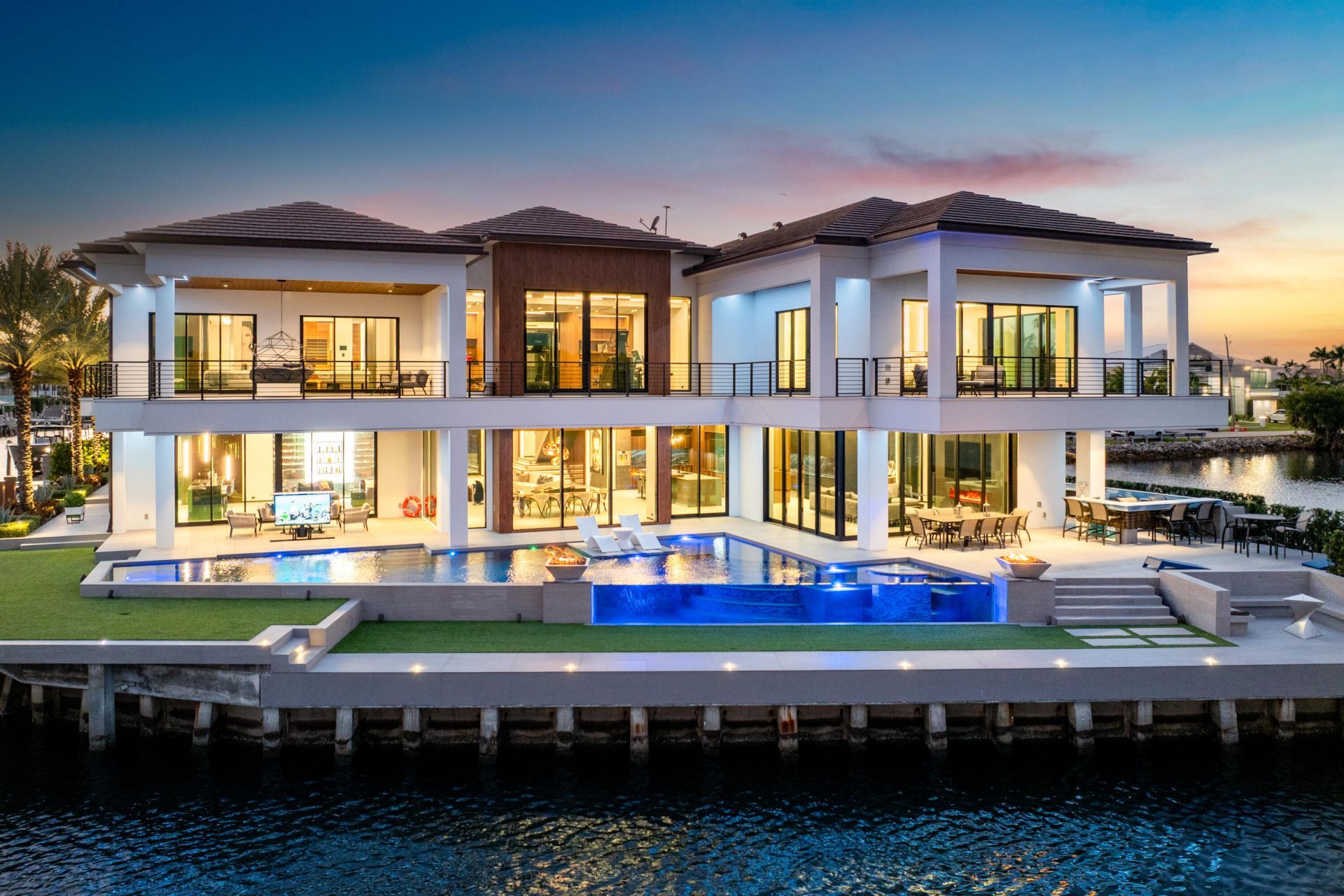 Introducing Trinity Point Estate, a one of one waterfront compound in Boca Raton, now presented for the first time ever. Positioned on an extraordinary point lot with 368 feet of water frontage, the estate captures sweeping Intracoastal views spanning the East, South, and North exposures, delivering true 360 degree water vistas from nearly every room. Spanning approximately 14,000 square feet, this newly constructed residence was designed with a focus on scale, privacy, and seamless indoor-outdoor living. Every space is thoughtfully oriented to maximize natural light and frame the surrounding water, creating a constant connection to the outdoors. The home features a 2,000 square foot primary suite, offering a private retreat with expansive water views, oversized dual closets, and a spa inspired bath. Additional highlights include a fully built out gym, private elevator, multiple guest suites, and expansive living and entertaining areas finished with the highest level of craftsmanship. At the center of the outdoor experience is a dramatic see through infinity edge pool designed by Lucas Congdon of Insane Pools, perfectly positioned to overlook 368 feet of unobstructed Intracoastal frontage, creating a true resort style setting. Enhancing the backyard experience is a 75 inch pop up outdoor television integrated into the patio deck, rising to frame the jacuzzi, an ideal setting for relaxed evenings and watching sports in a resort style environment. The chef's kitchen is anchored by Eggersmann German cabinetry and a curated suite of Gaggenau, Sub Zero, and Miele appliances, complemented by a full Kalamazoo outdoor kitchen featuring a professional grade BBQ, gas cooktop, and pizza oven. Built to a commercial standard rarely seen in residential construction, the estate includes a MEI commercial grade elevator with a 2,500 pound capacity, a 100KW Generac generator, Lennox variable speed HVAC systems, and full home Control4 automation. The residence is further enhanced by Level 5 drywall throughout, Fleetwood impact glass and sliding doors, closed cell insulation across all exterior walls, and a fully waterproofed building envelope, delivering exceptional efficiency, durability, and storm resilience. Wellness and lifestyle features include a Sunlighten infrared sauna, whole house triple water filtration system, advanced air and scent integration with Aroma360, and state of the art security with live virtual monitoring. Crafted with the finest materials and built to the highest standards of sustainability, Trinity Point Estate blends timeless design with modern innovation, offering one of the most significant and thoughtfully executed waterfront residences in South Florida. This is more than a residence, it is a landmark property.