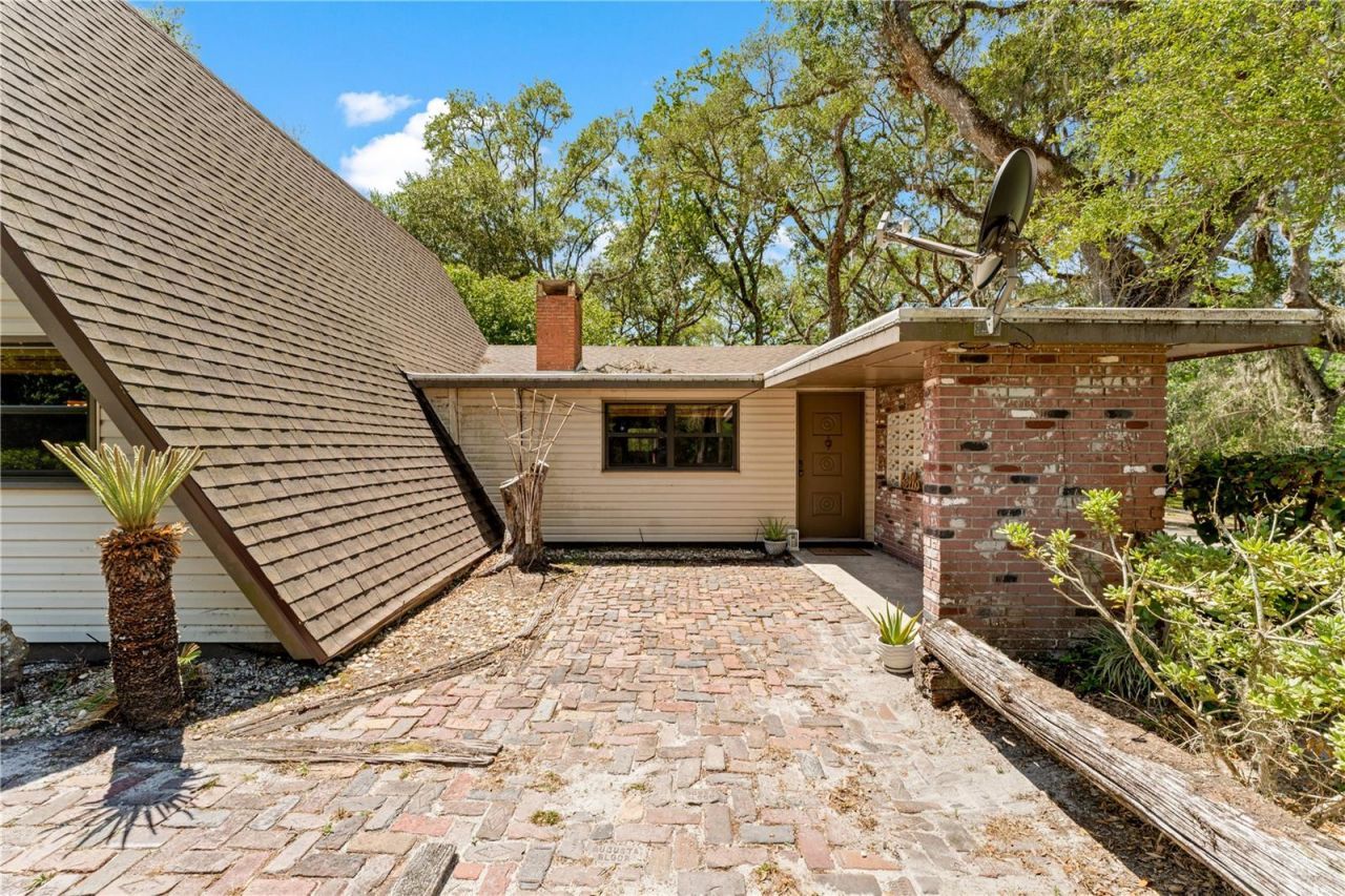 One or more photo(s) has been virtually staged. Nestled beneath a canopy of mature trees along the Withlacoochee River, this rare mid-century modern A-Frame retreat offers privacy, character, and over 5.6 acres of Old Florida landscape just minutes from Dade City. Built in 1963 & 1975, this distinctive property blends architectural charm with a peaceful natural setting rarely found.Inside, the home features soaring vaulted and cathedral ceilings, exposed beams, and rich wood detailing that create a warm, lodge-like atmosphere. The main living space is anchored by a brick wood-burning fireplace and custom-built bar. The floorplan flows into a kitchen with solid surface counters and generous counterspace.The flexible floor plan offers a primary bedroom on the main floor, along with multiple additional spaces such as a library, office, & loft. These spaces give the floorplan a unique charm and opportunity for creative use. Situated on over 5 acres (additional adjacent acreage available), the property includes direct canal and river frontage on the Withlacoochee River, allowing you to enjoy kayaking, fishing, and nature right from your backyard. Outdoor features include a patio, circular drive, private yard, and attached two-car garage, plus additional storage with a shed.Located on a quiet dirt road with a private entrance, this property offers the perfect balance of seclusion and convenience, with easy access to US-301, downtown Dade City, shopping, and dining.A rare opportunity to own a one-of-a-kind riverfront property with acreage, architectural character, and endless potential.