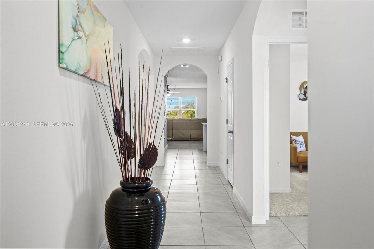 Beautiful 2023 built home in a peaceful Palm Bay community that truly stands out. This 4 bedroom, 2 bathroom residence offers a comfortable, open layout perfect for both everyday living and entertaining. Positioned on a desirable corner lot with a stunning lake view, the home feels larger and offers added privacy. Thoughtful upgrades include hurricane shutters with an electric front entrance shutter, ceiling fans throughout including the lanai, upgraded French doors, enclosed lanai and entry, and enhanced landscaping. Low HOA of $255 quarterly. Conveniently located near shopping, dining, and major roadways. Furniture negotiable. This is one you dont want to miss!