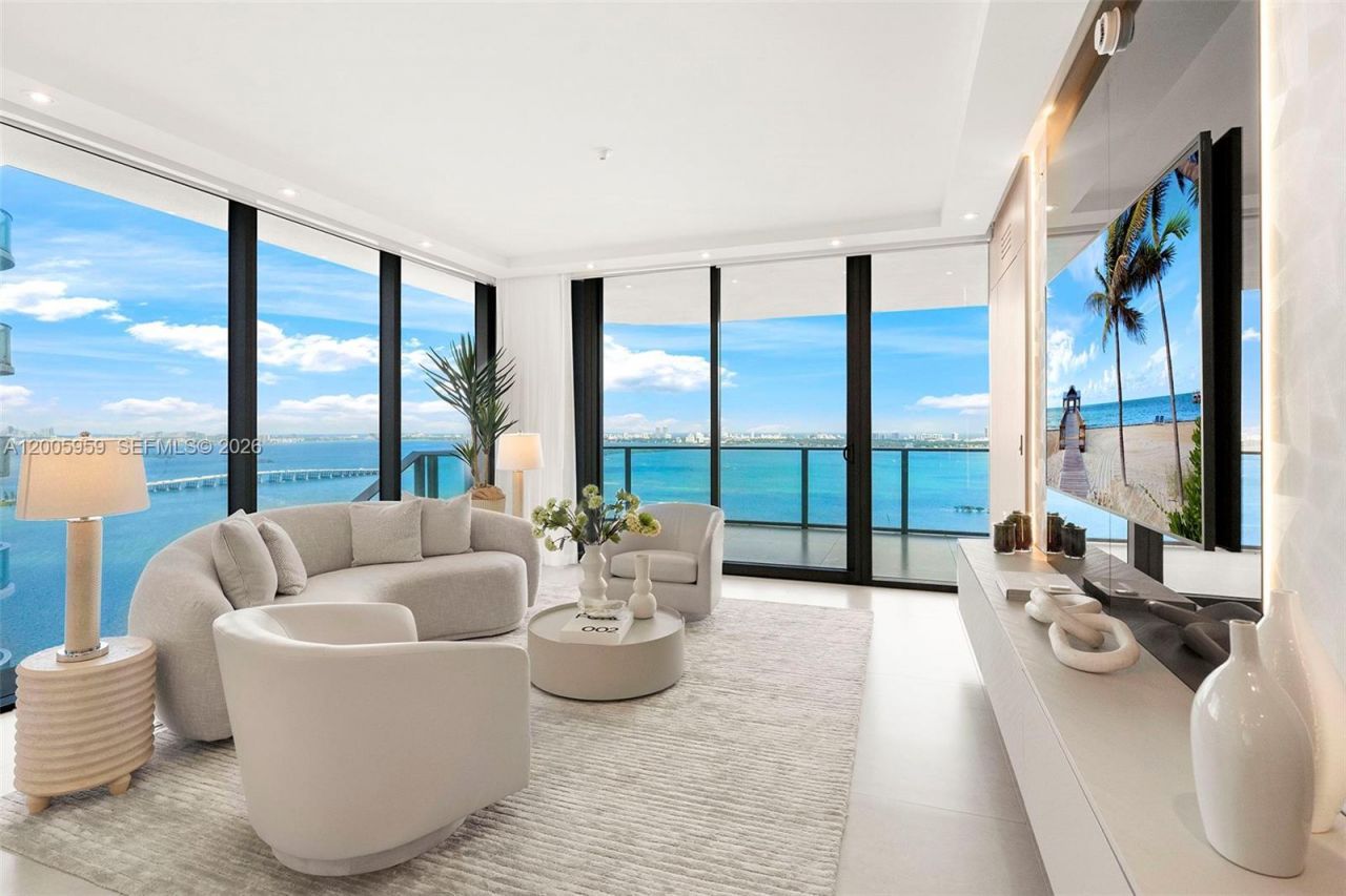 Welcome to your COMPLETELY REIMAGINED northeast corner residence at Aria Reserve South on the 32nd floor with forever unobstructed Biscayne Bay and ocean views from an expansive terrace. The only fully renovated residence of its kind in the building (all developer finishes have been changed), featuring brand-new custom imported flooring and a custom PEDINI chefs kitchen with premium Thermador appliances and quartzite countertops, complemented by custom doors, millwork, motorized window treatments, wallpaper, and built-out closets throughout. Every detail considered, no expense spared. All bedrooms feature redesigned en-suite bathrooms, while the primary suite includes dual sinks and an oversized walk-in closet. The residence also includes a private elevator entry with foyer, service entrance with storage, and a den. Residents enjoy 2 acres of world-class amenities, including 3 pools, sauna, steam and massage rooms, fitness center, game room, childrens room, conference center, putting green, and sport courts for tennis, basketball, and pickleball. Prime Edgewater location near Margaret Pace Park with easy access to Miami Beach and Downtown.